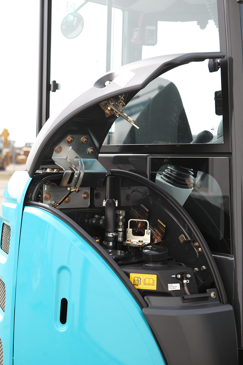 Enkel serviceadgang – frontpanel og kabin med god tilgang til motor og hydraulikk.